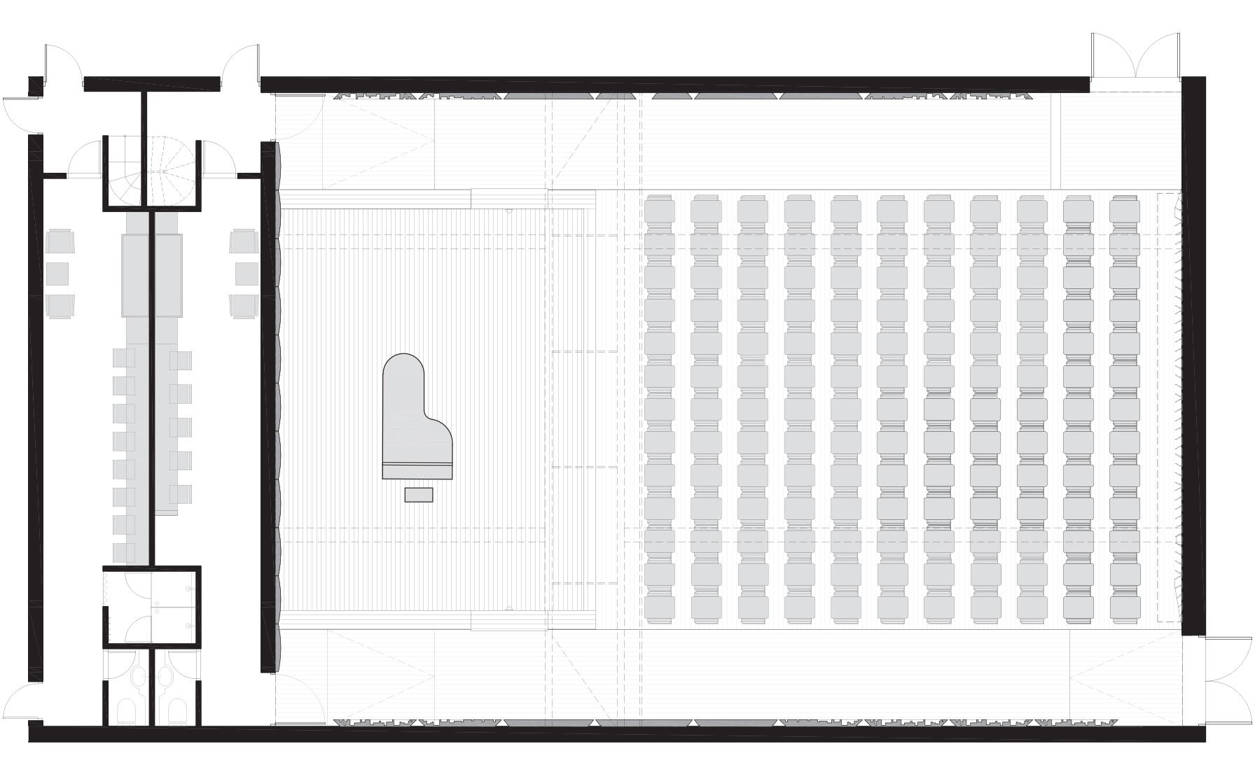 Over time, the hall suffered from gradual wear, ad-hoc interventions, and unfinished mechanical infrastructure. Its restoration became essential not only to reverse this deterioration but also to support the institution’s renewed ambition for more outward-facing activities. The primary goal was to reclaim the hall’s architectural clarity and elegance by removing interventions that had accumulated over half a century.